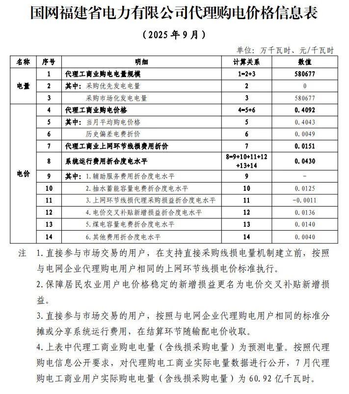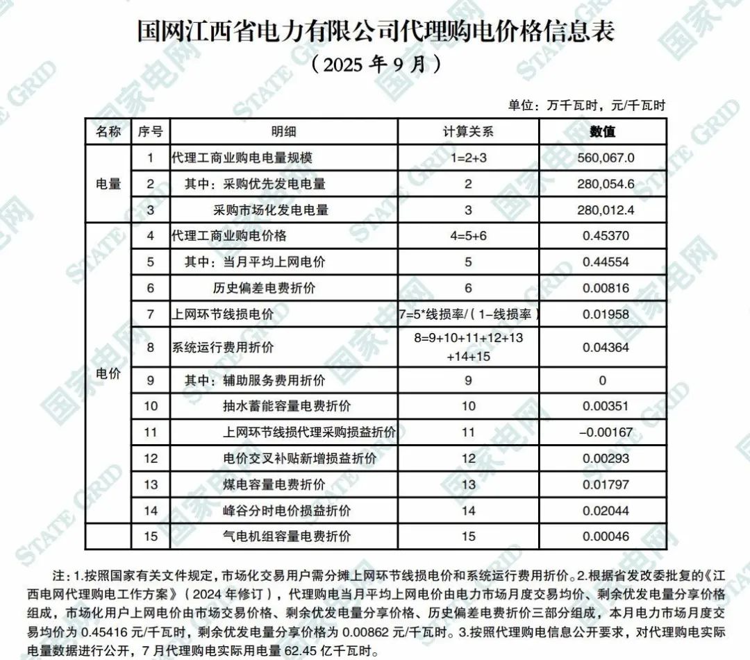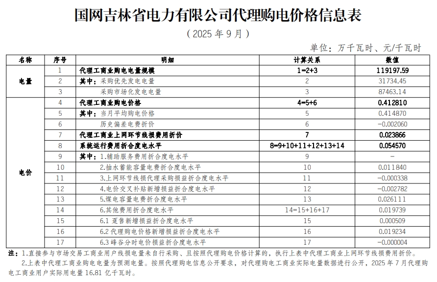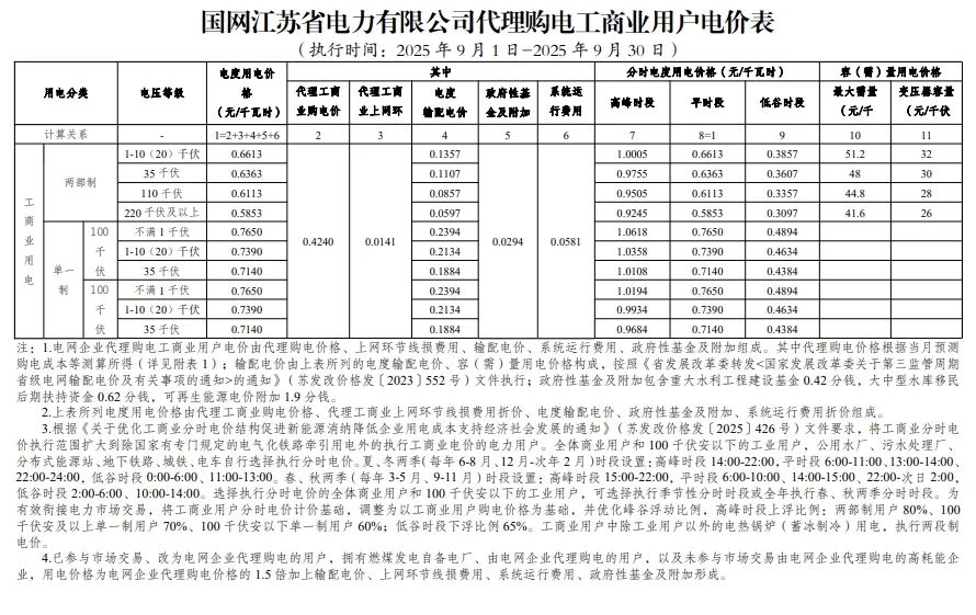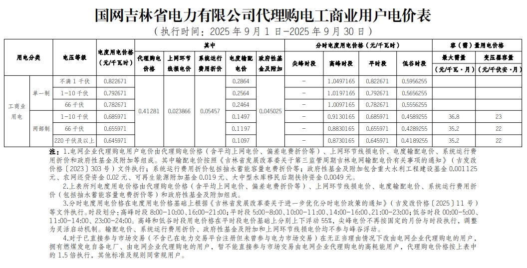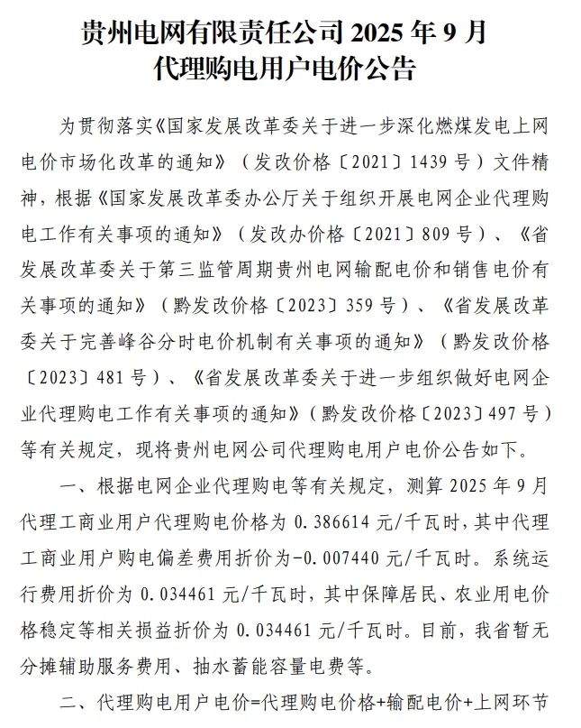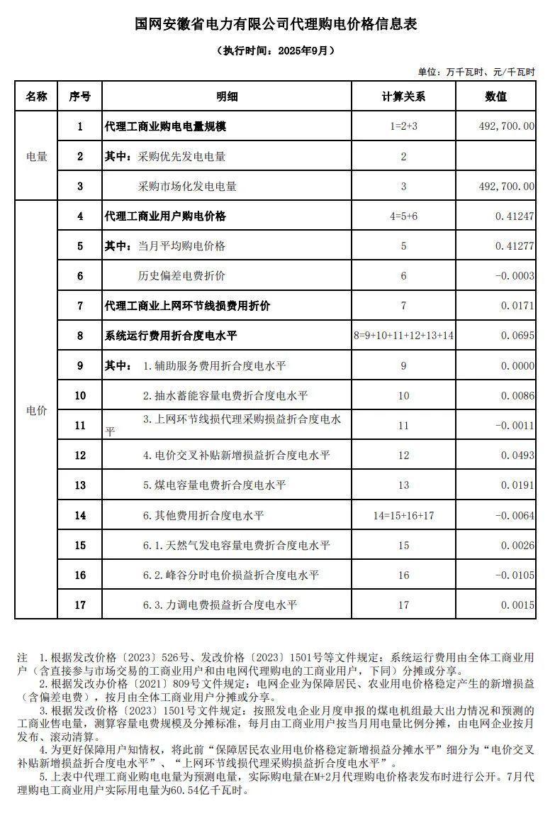以下为2025年9月各地电网企业代理购电价格表,顺序依次为:江苏、安徽、广东、山东、山西、北京、河北、冀北、河南、浙江、上海、重庆、四川、黑龙江、辽宁、吉林、内蒙古东部、内蒙古电力集团、江西、湖北、湖南、青海、宁夏、陕西、天津、甘肃、新疆、广西、海南、贵州、云南、深圳、福建。