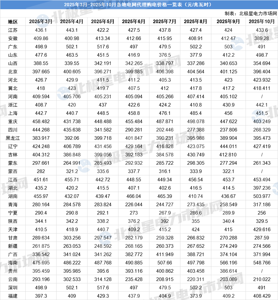北极星电力市场网获悉,近日,全国各地2025年10月电网企业代理购电价格陆续公布。北极星电力市场网汇总了2025年3月-2025年10月各地电网企业代理购电价格,如下表所示: