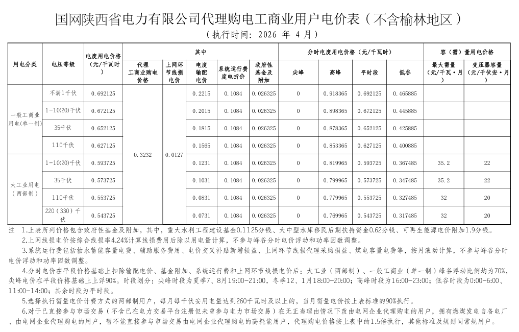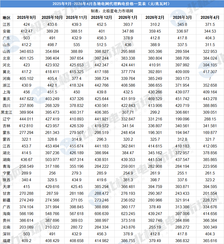 北极星电力市场网获悉,近日,全国各地2026年4月电网企业代理购电价格陆续公布。北极星电力市场网汇总了2025年9月-2026年4月各地电网企业代理购电价格,如下表所示: