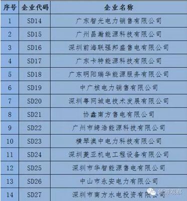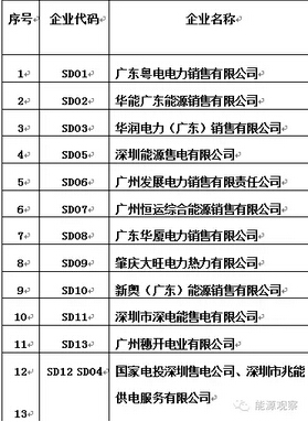目前广东公布第一批、第二批售电公司名单。首批13家参与竞价的售电公司中,包括粤电力、华能、华润电力、国电投、深圳能源等8所属售电公司,还包括新奥(广东)能源销售公司、深圳深电能售电公司、深圳兆能供电服务公司等民营企业,以及广州经济开发区成立的广州穗开电业公司。
