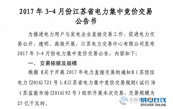 江苏:2017年3-4月份电力集中竞价交易公告
