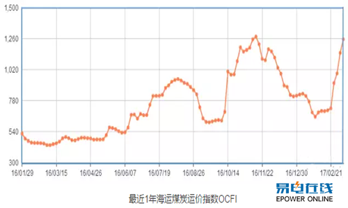 1月24日,海运煤炭运价指数OCFI报收654.53点,一路上涨,3月3日突破1000,最新一期(3月7日)达1255,期内涨幅105点,同比涨幅189%。仅比一年内最高点1275低20点。